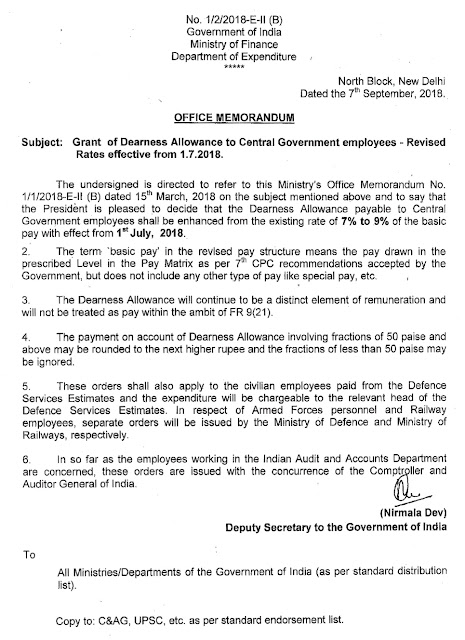 no. 8-1/2016-PAP, Dated 12-09-2018 for the revised rate of DA w.e.f 1st July